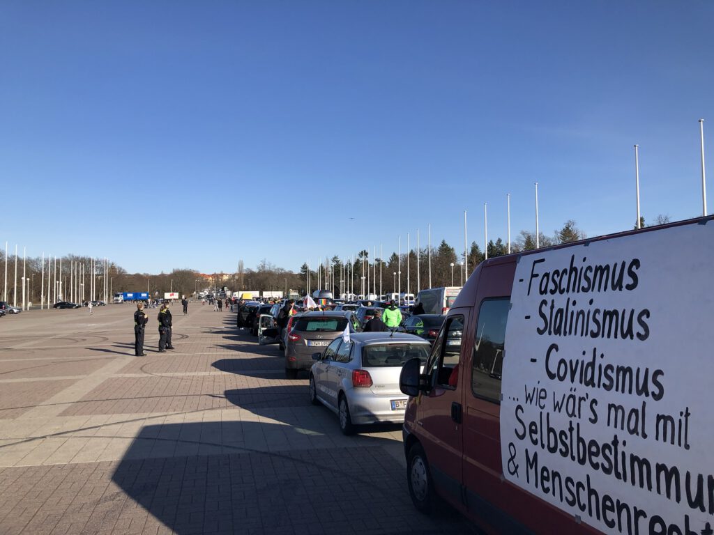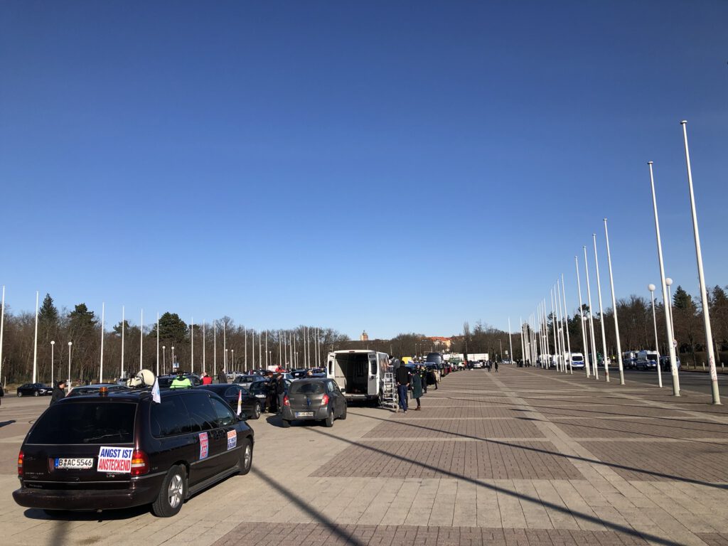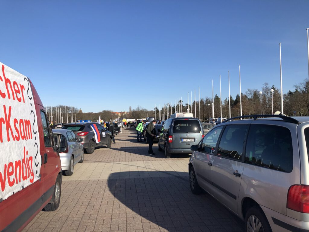 Dort hatte ein „antifaschistischer“ Frauenmarsch stattgefunden und war beendet und die Teilnehmer waren im Abfluß. Als sie von der bevorstehenden Ankunft des Autokorso Berlin hörten, kehrten viele zurück. Die Polizei trennte die beiden Demo-Lager. Die Antifas mußten in die Mitte des Herrmannplatzes und wir hielten Kundgebung auf der Straße.
