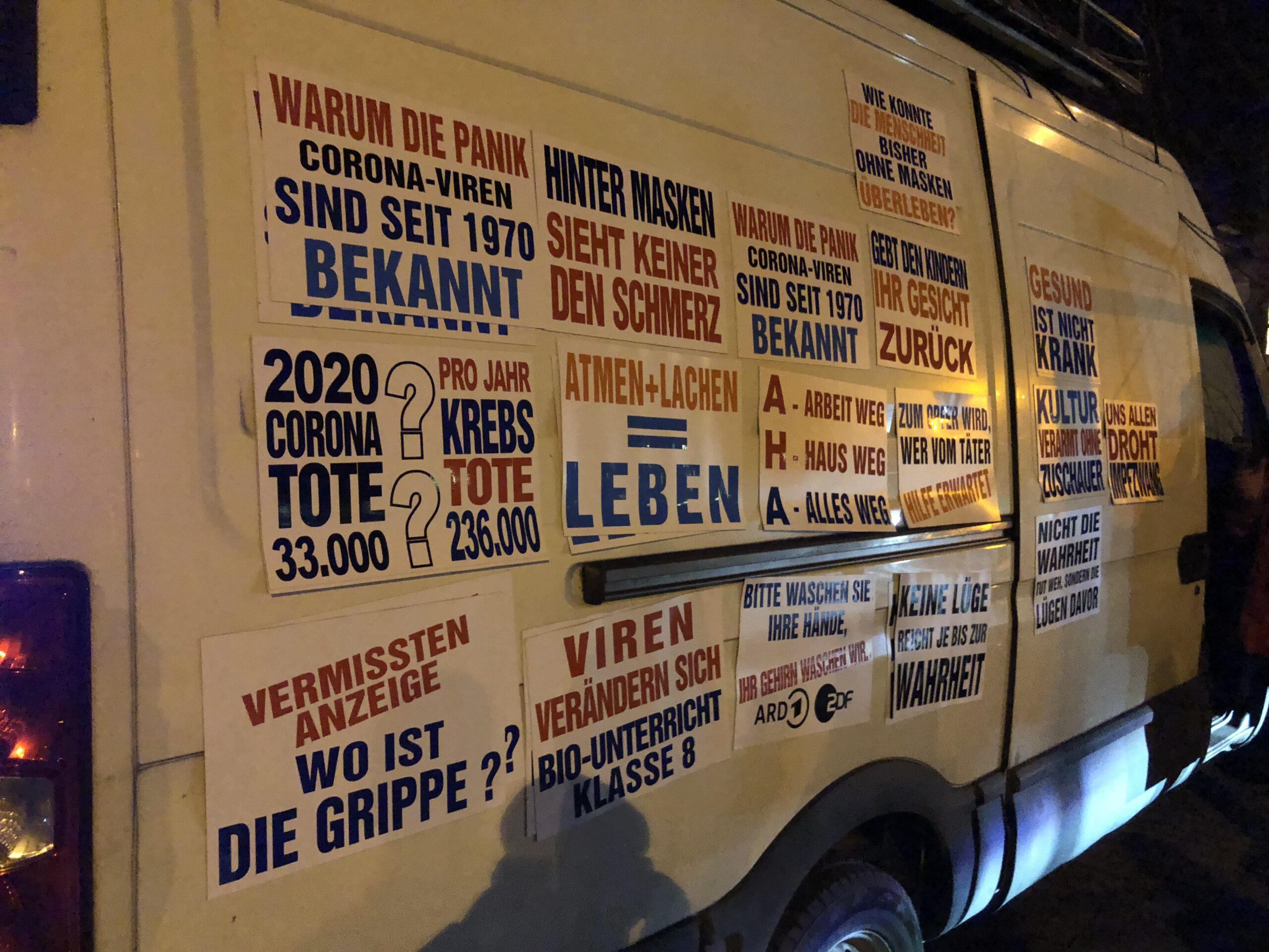 Nun ging es Schlag auf Schlag. Am Montag der Autokorso-West vom P3 des Messegeländes, sind schon zwei Korso die Woche. Zwischendurch ein Autokorso-Süd vom P&R Altglienicke und ein Autokorso-Nord vom P&R Pankow-Heinersdorf. Immer mit über hundert teilnehmenden Pkw, Kleintransportern, sogar ein Lkw fuhr mit. Einmal sogar etwa 450 Fahrzeuge. Die ersten waren schon am Strausberger Platz, als die hinteren noch in Friedrichsfelde-Ost fuhren. Seitlich wurden wir von Radfahrern begleitet, die sich Lichterketten umgehängt hatten.